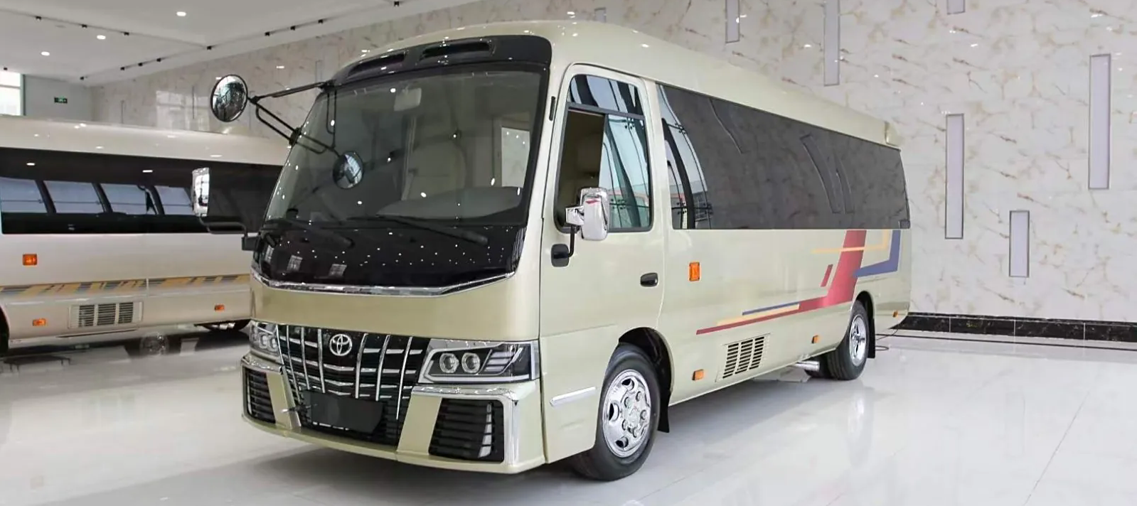 柯斯达(Coaster)是丰田公司旗下高端商务客车,由一汽丰田生产,指导价41.84-55.89万元。车型定位大型轻客,车身尺寸为7005×2040×2760毫米(高顶版),轴距3935毫米,舱内净高最高达1.89米,标配非承载式车身结构,提供20/23座基础布局并支持9-30座定制化服务。全系搭载4.0L V6自然吸气发动机(型号9GR),最大功率151kW/4200rpm,峰值扭矩344N·m/4200rpm,匹配5速手动变速箱,最高时速130km/h,综合油耗15-18L/100km。豪华版配备电动侧滑门、隐私玻璃及前独立悬挂系统,标准版采用叶片弹簧后悬挂。